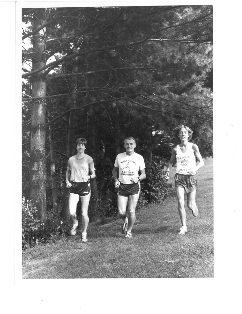 After college, Jacoby returned to Berks and found herself a new coach: Jim Sutton. “Doc” (as he was known) encouraged her to shift her focus to road racing and to run longer distances. Sutton, Jacoby, and Beth Guerin often trained and raced together during these years. “We were almost akin to a team,” Jacoby reminisced. After a win and a couple other top-5 finishes in 10k races throughout PA, Jacoby ran her first marathon, along with Guerin, in March of 1979–the Prevention Marathon (now St. Luke’s) in Trexlertown–which she won, with a 2:58. The following year, she ran the race again (with Sutton this time), and she won again, shaving ten minutes off her previous time for what would end up being her personal best: a stunning 2:48:48. And this was done under adverse conditions: Jacoby remembers running parts of the race with numb feet after splashing through giant puddles of melted snow.