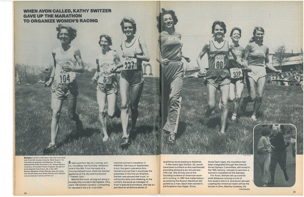 That went on for about five years, during which Jacoby won nine 10k’s in addition to her two marathon victories and wins at various other distances. She also competed in the national and international Avon races, organized by activist-runner Katherine Switzer, famous for her defiant Boston Marathon run in 1967. Switzer organized this race series to prove that women runners could compete at elite levels.