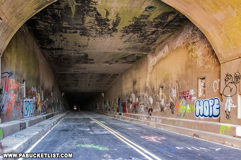 At about 4 miles, the course began another uphill climb towards the second tunnel, and we got there a little after mile 5. The tunnels were rather neat to run through with graffiti on the walls and the floor. And the road surface in the tunnels was in pretty decent shape, so you didn’t need to pay too much attention to footing!