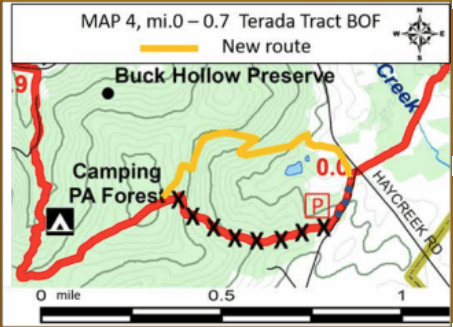 A few years ago the so-called Terada Tract of land was acquired by the state of PA and given to the William Penn State Forest to manage. When possible, the HST Conservancy tries to route the trail on to public/state land. When the trail crosses private property, there is alway the risk of a landowner rescinding permission for trail use or the property is sold and new owners don’t want the trail on their property. So it was pretty obvious that this was a good opportunity to move the trail off from private property to protect more of the trail. The HST Conservancy worked with the state to place the trail on the tract and this year finally got approval from the Bureau of Forestry to proceed.