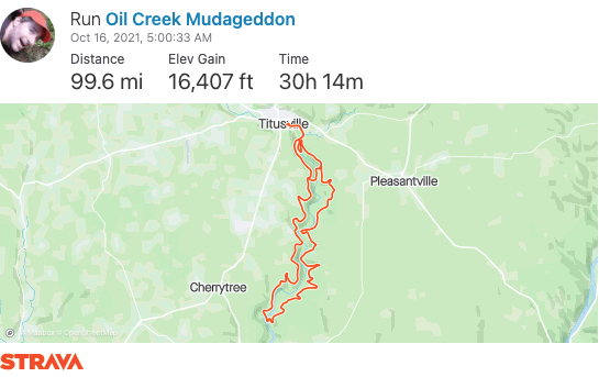 Originally, I wanted to run the Midstate Massive Ultra, which is a point-to-point race that starts in southern New Hampshire and traverses the entire state of Massachusetts from north to south. But this race conflicted with the wedding of a very old friend that I really didn’t want to miss, so I ended up pivoting to the Oil Creek 100, which was the following weekend. (Steve Vida, whom I had convinced to sign up with me, also graciously pivoted to accommodate my needs). Little did we know we were trading in a cool, dry autumnal weekend in New England for a massive mudfest in western PA.