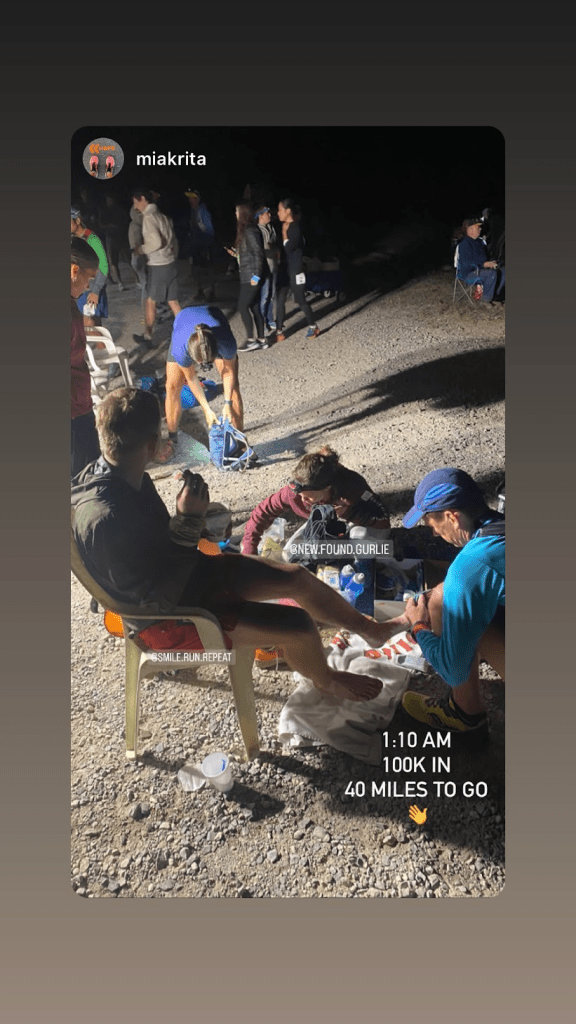 With about 10 miles to go, I started to get very dizzy and my vision quickly tunneled in to a small circle. Without looking up from my feet, I said, “Steve, I keep getting dizzy.” In classic Steve fashion, he responded with “okay.” I decided to look up, and all of a sudden I really got dizzy, but my visual field expanded exponentially and Steve said, “Good–a change of perspective.” It was at this point that I felt my lowest, and Steve said later that he realized I was in a really tough spot. Steve has a saying that is well known within his family, and he pulled this out (somewhat jokingly) at this moment, “It will all work out.” Luckily, it was at this point that we noticed three individuals walking towards us over the horizon. These three were Andy, his girlfriend Kim, and Kelly Ammon. Kelly asked what they were surely all thinking, “How are you feeling?” All I could think of for some response was, “Eh, okay I guess. Like I have traveled 93 miles.” Seeing familiar faces lifted my spirits tremendously. I knew at this last aid station with my crew, Barrens, I could not sit, and would need to pass off my bottles, grab food, and keep moving. I looked at Michelle H. and said, “I cannot sit; I love you; thank you.” Later Michelle told me she had piled stuff on the chair so I had no other option but to stay standing.