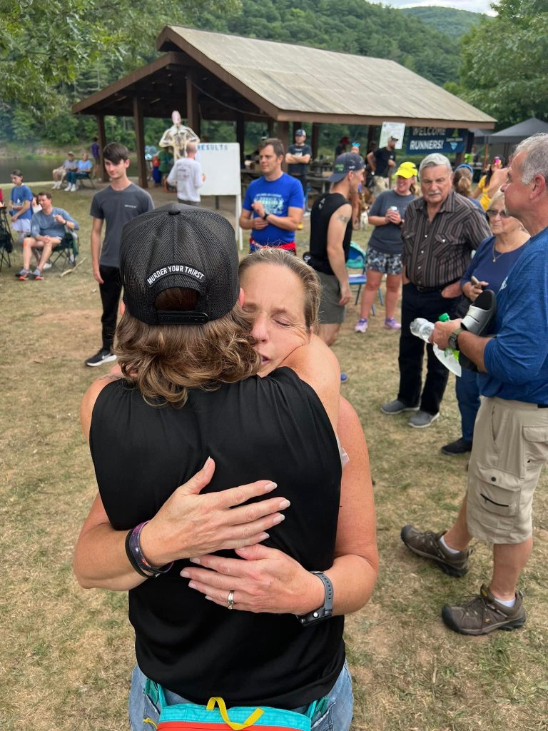 How much farther is this??? I am starting to think I’ll never finish.  Wait, is that people cheering?  Can it be?  I think I am there!  I tried to go a bit faster, but I just couldn’t, and then I saw the grassy section at Little Pine State Park. I saw orange cones and I knew I was there. Christine was still pushing and I was trying. We got to the bottom of the trail, crossed the road, and I was not sure how my legs were doing it, but they were running. I was numb; I started to tear up; I felt so much.