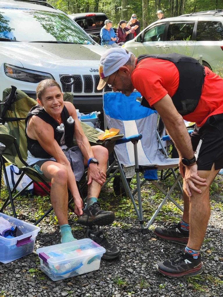 There was a pretty good climb from AS 4 to AS 5. The combination of heat, humidity, and hills really impacted my breathing, and I was struggling coming into AS 5, “Happy Dutchman.” It was probably one of my lowest moments. But I was also told the first 50k was the hardest. And my crew surprised me being there to cheer me on.