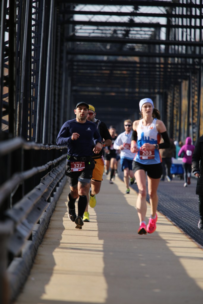 For those unfamiliar with the Harrisburg Marathon, it is a double loop course that goes across 3 bridges, up and down Front St that runs along the Susquehanna, around a PennDot Building, and 2 U-Turn turnarounds. The half marathon and 4-person relay were run concurrently.