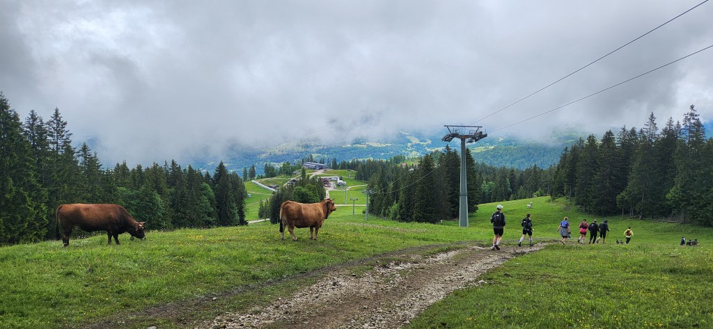 At noon sharp, the race started – German punctuality at its finest! For the first few minutes, my mind was filled with all the typical thoughts. For me, these are: “Why am I doing this? I don’t belong here,” “Am I going to make the cutoff?” and “What if I don’t finish?” But soon, these thoughts faded as I settled into race mode. They were instead replaced with the sound of spectators lining the streets to cheer on runners as we winded through the town and into the trails. The cheering was replaced by the sound of roaring cowbells–on actual cows–as we ran through the herd. This happened randomly throughout the race, and it was fun to see and hear them as they roamed alongside (and sometimes on) the trail.
